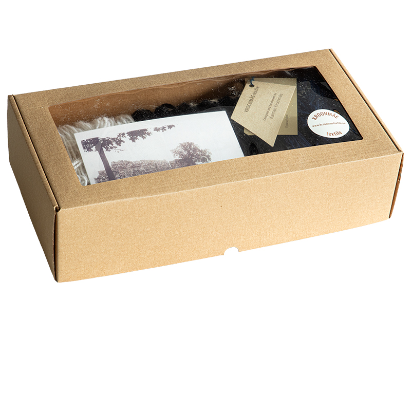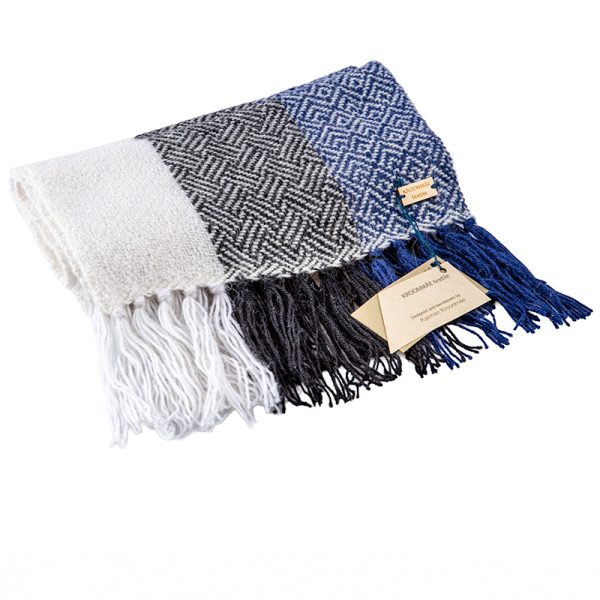 Kangastelgedel kootud kohalikust lambavillast luksuslik sinise-valge-mustakirju triipudega sall, kinkekarbis